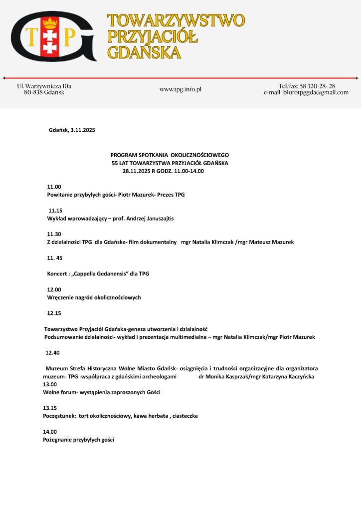 SPOTKANIE OKOLICZNOŚCIOWE Z OKAZJI 55 LAT TOWARZYSTWA PRZYJACIÓŁ GDAŃSKA LISTOPAD 2025